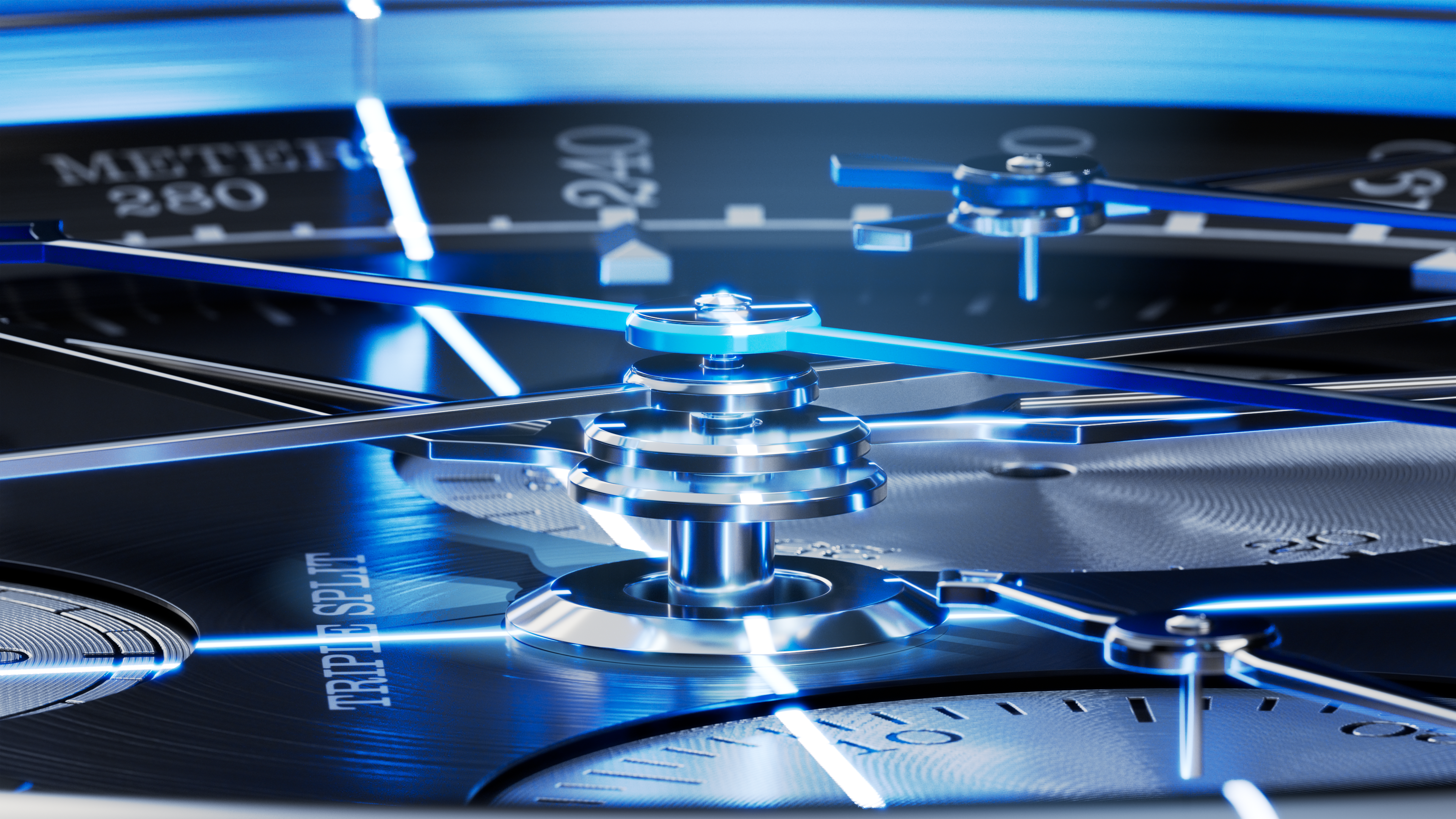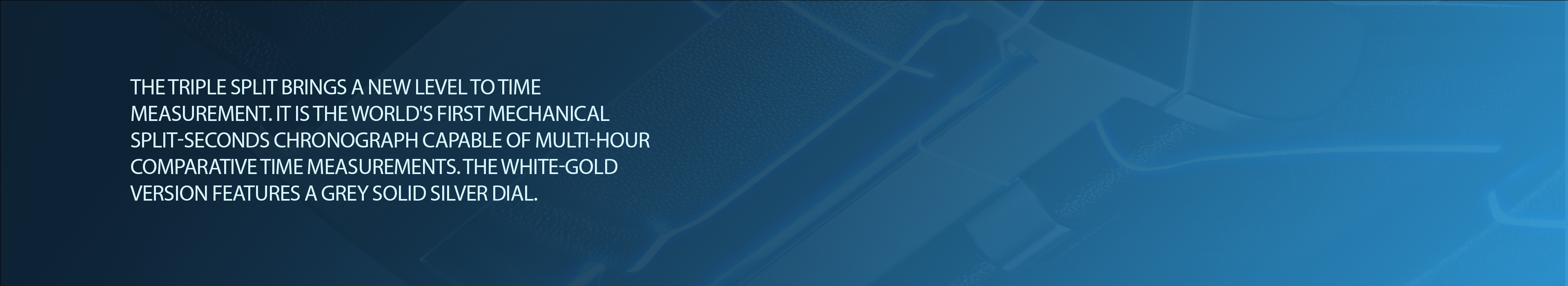 The TRIPLE SPLIT brings a new level to time measurement. It is the world's first mechanical split-seconds chronograph capable of multi-hour comparative time measurements. The white-gold version features a grey solid silver dial.